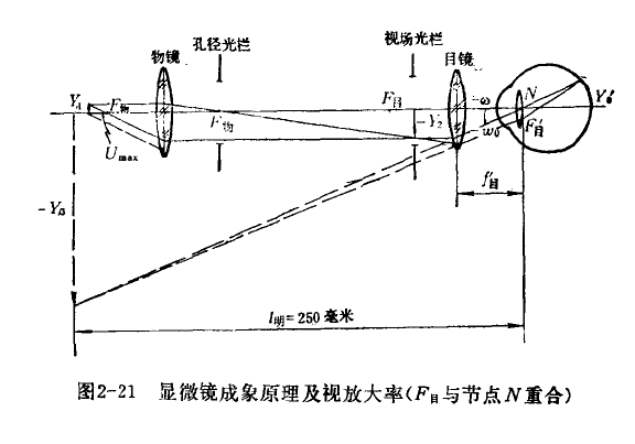 金相顯微鏡的成象系統主要是物鏡系統和目鏡系統。為了校正象差,目鏡和物鏡都是由兩個或多個透鏡組成的。為了便于討論成象的基本原理,可以不考慮物鏡、目鏡的實際結構,而分別用兩個凸透鏡來代替它進行討淪。顯微鏡的成象原理見圖2—21。物體Y1放在物方焦點F外側,物體的光線經過物鏡成一放大倒立實象Y2于目鏡物方焦點F目內側,對目鏡來說Y2是目鏡的物。目鏡的作用如同放大鏡一樣,將Y2再一次放大成一虛象Y3在明視距離處(第二次放大)。